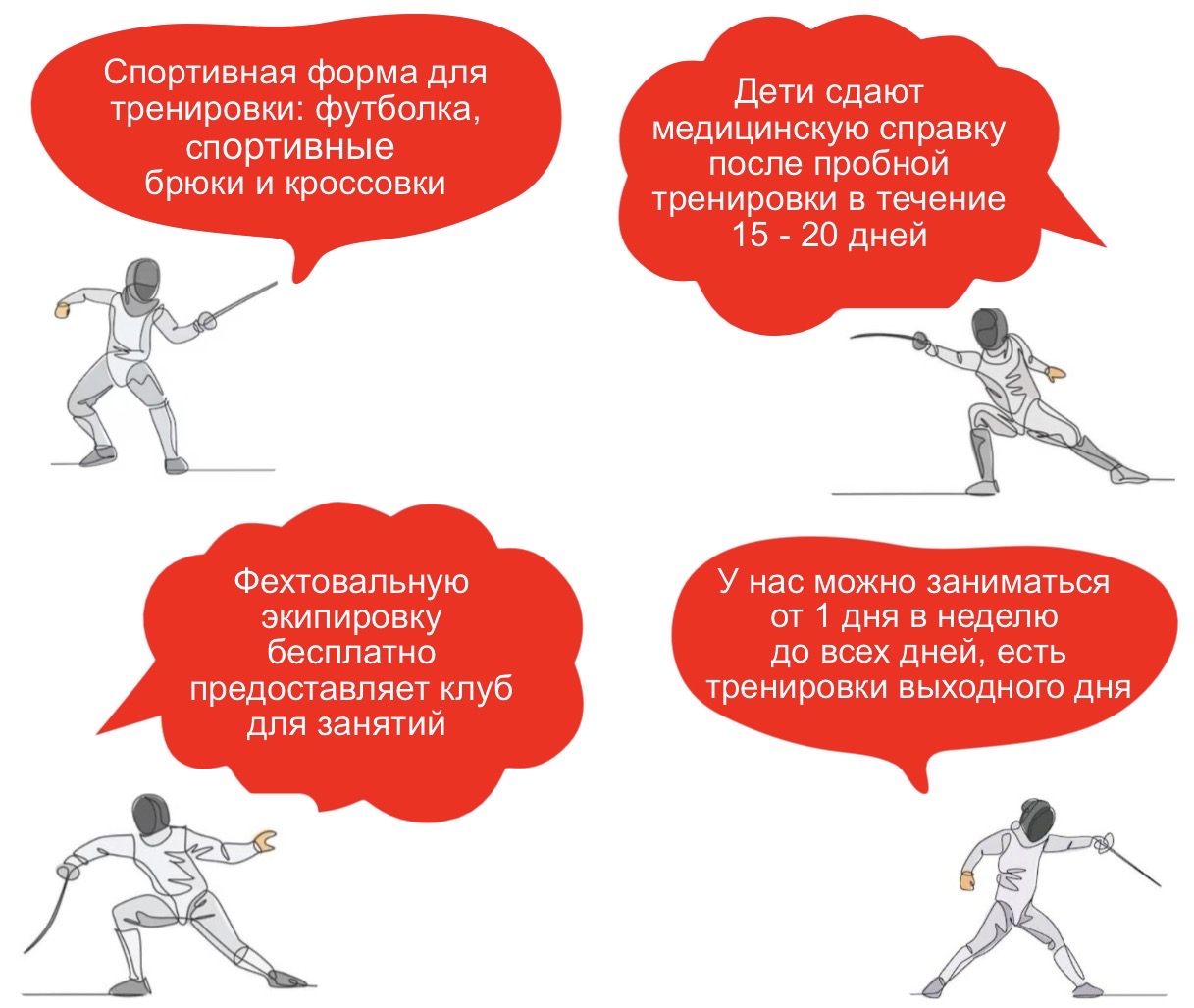 2. Для тренировок всем спортсменам предоставляется фехтовальная экипировка, стандарта ФИЕ, спарринги проходят на профессиональном оборудовании.